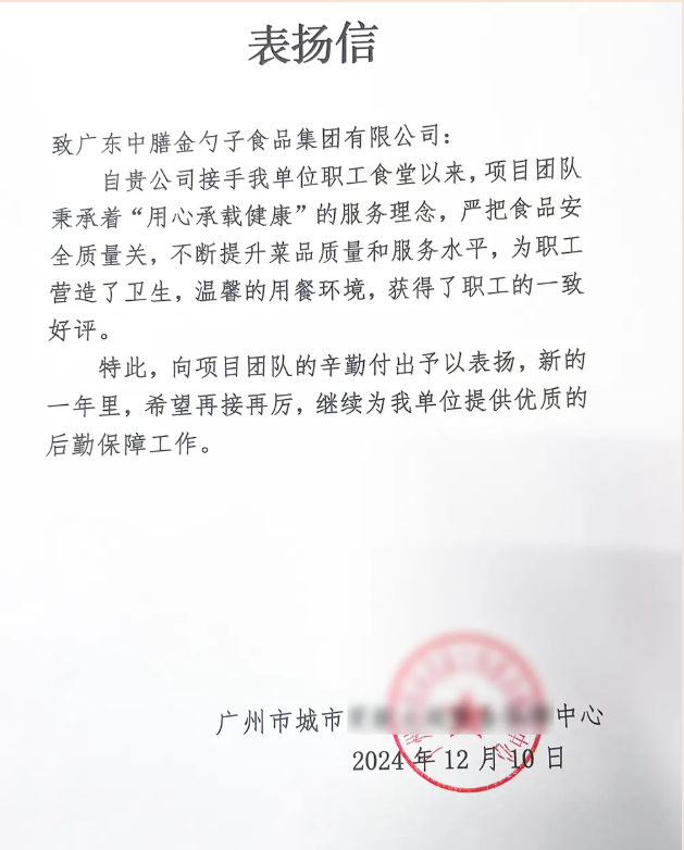 12月24日,廣州某監管中心的表揚信中表示:“項目團隊嚴(yan) 把食品安全質量關(guan) ,不斷提升菜品質量和服務水平,為(wei) 職工營造了衛生,溫馨的用餐環境,獲得了職工的一致好評。”