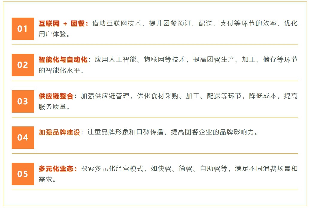 綜上,近年團餐行業(ye) 發展前景良好,市場規模持續擴大,品牌競爭(zheng) 加劇,智能化和數字化成為(wei) 行業(ye) 發展趨勢。團餐企業(ye) 需不斷創新和提升服務質量,以滿足消費者需求,搶占市場份額。