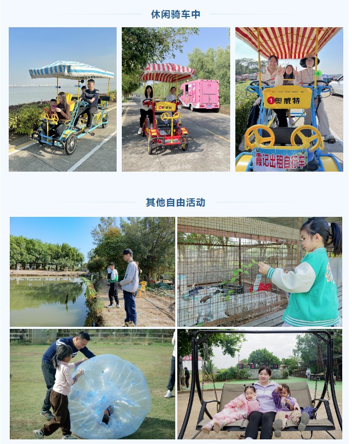 下午,大家在農(nong) 場內(nei) 自由活動。體(ti) 驗卡丁車、釣魚、騎車遊海鷗島、捕魚、打野戰等豐(feng) 富多彩的活動,享受大自然的恩賜,度過一段愉快的時光。